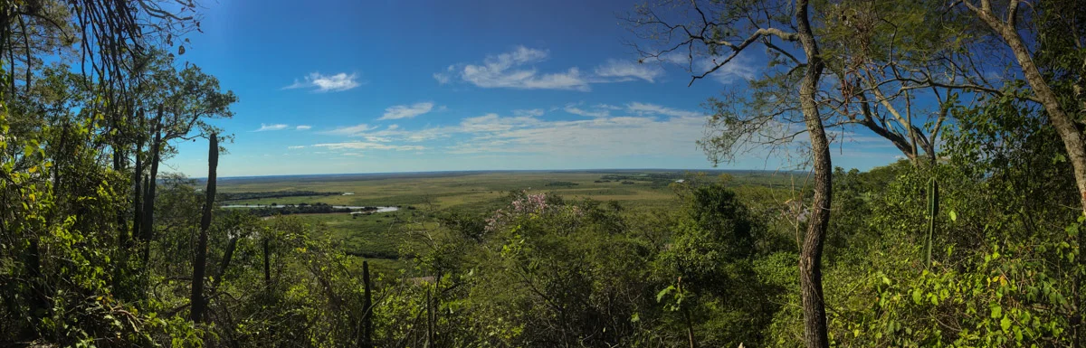 After 1.5 hours in the boat, we pulled into shore and began walking the short distance to the top of one of the few hills. A short walk it might have been but it was steep, and we needed the help of some strategically placed ropes to haul ourselves up. The view from the top was majestic, a vast plain of every shade of green you could imagine. Circling overhead searching for their next meal, a kettle of black vultures.