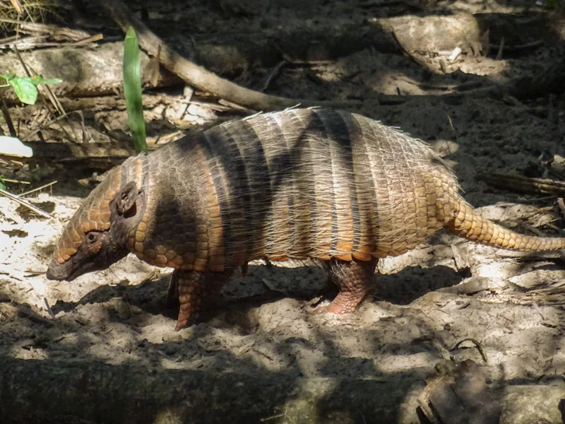 During the walk we spotted howler monkeys leaping from branch to branch. These are not called howlers for no reason; boy can they make some noise. Being at the head of the group we had great view of an armadillo that was wandering across our path. When the rest of group caught up the funky creature had disappeared into the bush. Then, we came across a large group of sleeping wild pigs. Slowly they stirred. Making a hasty retreat we didn’t hang around to see whether they going to try to circle us. Where is that red ant laden tree?