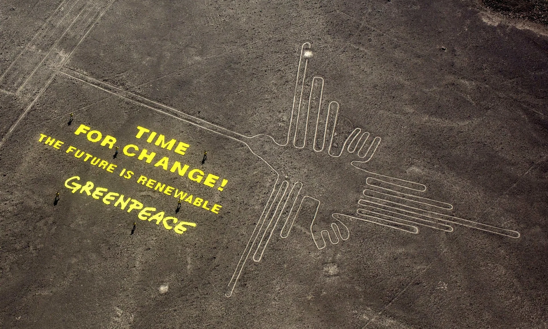 There was a lunch stop at some dodgy looking Peruvian transport cafe that came complete with emancipated dogs. Following Julie’s lead, it was not long before several passengers were heading out the door with napkins of rice for the hungry pooches. The next stop was in the middle of nowhere at the fascinating Nasca lines. Just by the side of the Pacific Highway was a viewing platform that had the look of a temporary scaffolding structure. Our bus ticket included the admission cost to climb this rickety construction. From the top, you can clearly see the drawings which are believed to have been created a few years back. In fact between 500 BC and 500 AD by the Nazca culture. Most researchers believe that they have some religious significance, other believe the lines were created by aliens. Either way this is an amazing site with some of the drawings over 600 feet tall. Unfortunately, what Mother Nature had left alone for many centuries is now being disturbed by humans. Then there was the Greenpeace cock-up from late last year.