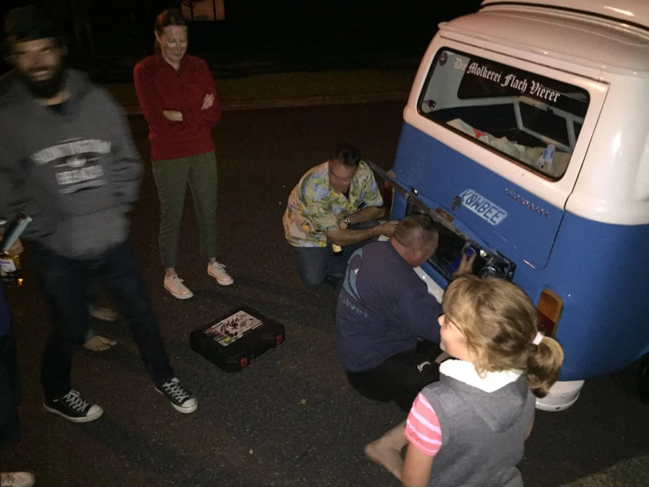 After 2,500 km’s of smooth running around the South Island the Tardis decided to pack a sad. We had been at a BBQ with a group of friends including Jamie (Dr. Kombi) from Motorworks. We backed out of the drive only to grind to a halt not more than 10 metres away. Well if you are going to break down there’s no better place. Jamie and the rest of the party descended, torches and sonic screwdrivers in hand. Forty minutes later and a quick lesson in hot wiring, we were on our way. Won’t bore you with technical details, suffice to say a 40 year old van on low profile tyres on New Zealand roads is asking for trouble.